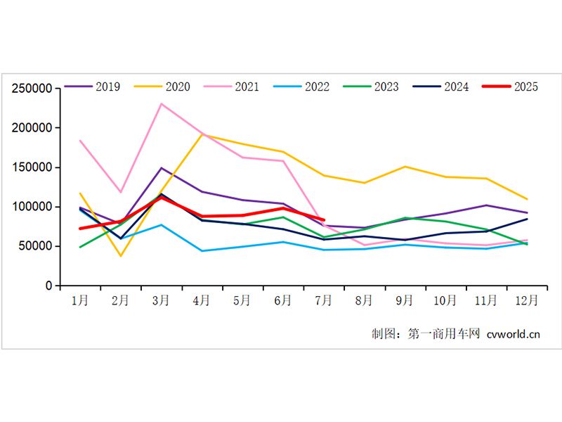 從今年4月至7月,我國重卡市場“四連漲”,并且增幅呈現出加速度,7月份銷量同比增速已經超過40%。在這個承上啟下的三季度第一個月里,各家主流重卡企業的表現究竟如何?請看第一商用車網帶來的分析報道。7月重卡銷8.3萬輛!電卡大漲,氣卡迎來“曙光”根據第一商用車網最新掌握的數據,2025年7月份,我國重卡市場共計銷售約8.3萬輛(批發口徑,包含出口和新能源),環比6月下降15%,比上年同期的5.83萬輛上漲約42%。這也是重卡市場自今年4月份以來的四連漲,且漲幅逐月擴大——4月、5月銷量同比增長6.5%和13.6%,6月份同比增長37%,7月份同比增超4成,跑出了市場加速度。8.3萬輛放在最近八年來看,屬于第二高水平,只低于2020年7月的13.9萬輛,比其他年份的同月銷量都要高。累計來看,今年1-7月我國重卡市場銷量約為62.2萬輛,同比增長約11%。2019-2025年我國重卡市場銷量月度走勢圖(單位:輛)7月份,不僅重卡批發銷量實現了42%的同比增長,國內終端重卡銷量也實現了同比上漲,雖未達到6萬輛以上規模,但同比漲幅超過20%,環比降幅預計在19%左右。需要提及的是,7月份重卡市場批發和零售銷量環比均有所下降的原因,是部分主流車企半年末沖量以及電動重卡上半年末突擊上牌,因此對后面月份的重卡銷量造成了一定透支,再加上市場需求逐漸進入“淡季”,因此,7月份重卡銷量環比下降是必然。7月份批發銷量和零售銷量繼續呈現同比上漲,首要原因仍然是國四貨車以舊換新政策。截止到5月底,幾乎所有省市自治區的貨車以舊換新細則都已完成落地,因此,5月中下旬、6月和7月,政策對重卡新車購置需求的促進作用穩定顯現出來。另外,今年7月份的重卡出口批發銷量預計同比增長超過20%,該細分領域的表現同樣超出預期。7月份,行業批發銷量和終端銷量再度雙雙同比增長,幾個重點細分市場的表現如何?先看燃氣車。7月份,燃氣車國內終端銷量環比有所回升,盡管同比呈現20%以上的降幅(這已經是連續第五個月同比較大下滑),但環比基本持平,國內滲透率預計也從6月份的20%以下復蘇到7月份的24%左右。其中原因,主要是油氣價差有所擴大,再加上北方以舊換新政策的落地和執行(北方地區是燃氣重卡的主銷區域),推動了燃氣重卡需求一定程度上的改善。預計該細分領域有望在今年8月實現“轉正”。再看電動車。今年年初至今,新能源重卡在中短途貨運市場上持續熱銷,加上貨車以舊換新帶來的舊車置換電卡需求,第一商用車網預計7月國內新能源重卡終端銷量超過1.5萬輛,同比增長超1.2倍(環比有兩位數下降),單月滲透率預計超26%。這已經是新能源重卡銷量連續五個月超過1.5萬輛、月度滲透率連續四個月超過23%、連續兩個月超過26%。此外,國內柴油重卡7月份終端銷量預計同比增長超過25%,但環比降幅也超過了25%。重汽2.2萬登頂!解放/東風破1.4萬,福田/徐工翻倍2025年7月,我國重卡行業銷量實現“四連漲”,幾家主流企業交出了什么“成績單”?第一商用車網數據顯示,在7月份的排位賽中,中國重汽以2.2萬輛“登頂”,解放和東風雙雙超1.4萬輛;同比增速跑贏大盤的企業有福田(134%)、徐工(100%)、東風(84%)和江淮(59%)。累計來看,2025年1-7月市場份額實現同比增長的企業包括福田、徐工和陜汽。具體來看,中國重汽7月份銷售重卡約2.2萬輛,同比增長約37%,銷量保持行業第一;其1-7月累計銷售約17.1萬輛,同比增長約10%,市場占有率約為27.5%。一汽解放7月份銷售重卡約1.5萬輛,同比增長約42%;2025年1-7月,解放重卡累計銷量約11.35萬輛,市場占有率約18.2%,累計銷量保持行業第二。東風公司(包括東風商用車、東風柳汽乘龍、東風華神等)7月份銷售重卡約1.4萬輛,同比漲幅約為84%,月銷量保持行業前三;今年1-7月,東風公司累計銷售各類重卡10.12萬輛,同比增長約10%,市場占有率約為16.3%。陜汽集團(包括陜汽重卡、陜汽商用車等)7月份銷售重卡約1.25萬輛,同比增長約12%;2025年1-7月,陜汽集團銷售各類重卡約10.18萬輛,同比增長約11%,市場占有率約16.4%,同比上升約0.1個百分點。從同比漲幅來看的話,福田和徐工是增速最高的兩家企業。北汽福田7月份銷售重卡約1.15萬輛,同比增長約134%,這也是主流企業中最大的同比增速;2025年1-7月,北汽福田累計銷售各類重卡約7.8萬輛,同比上漲約81%,市場占有率約12.5%,同比上升約4.9個百分點。以新能源重卡為主力的徐工重卡7月份銷車約0.3萬輛,同比翻倍;其1-7月累計銷售約1.98萬輛,同比增長約77%,市場占有率約為3.2%,上升了約1.2個百分點。江淮汽車2025年7月銷售重卡約0.13萬輛,同比增長約59%;1-7月累計銷售約0.9萬輛,同比增長約9%,市場份額約為1.4%。結束語三季度的第一個月,重卡批發銷量和國內終端銷量繼續保持同比上漲,為下半年市場開了個好頭。基于各地貨車以舊換新政策對新車市場的刺激作用,再加上去年下半年重卡銷量的連續多月走低(三季度月均批發銷量不到6萬輛,7-10月的月均批發銷量也只有6.1萬輛),預計今年三季度重卡銷量將會實現同比較大幅度增長,尤其是9月份的同比增速有望達到50%以上。